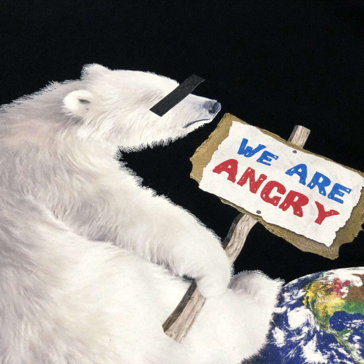 気候変動を止めようと人間に警告をする白くまが「僕たちは怒っているけど、まだ間に合う!地球は救える。」と訴える様子を現しています。